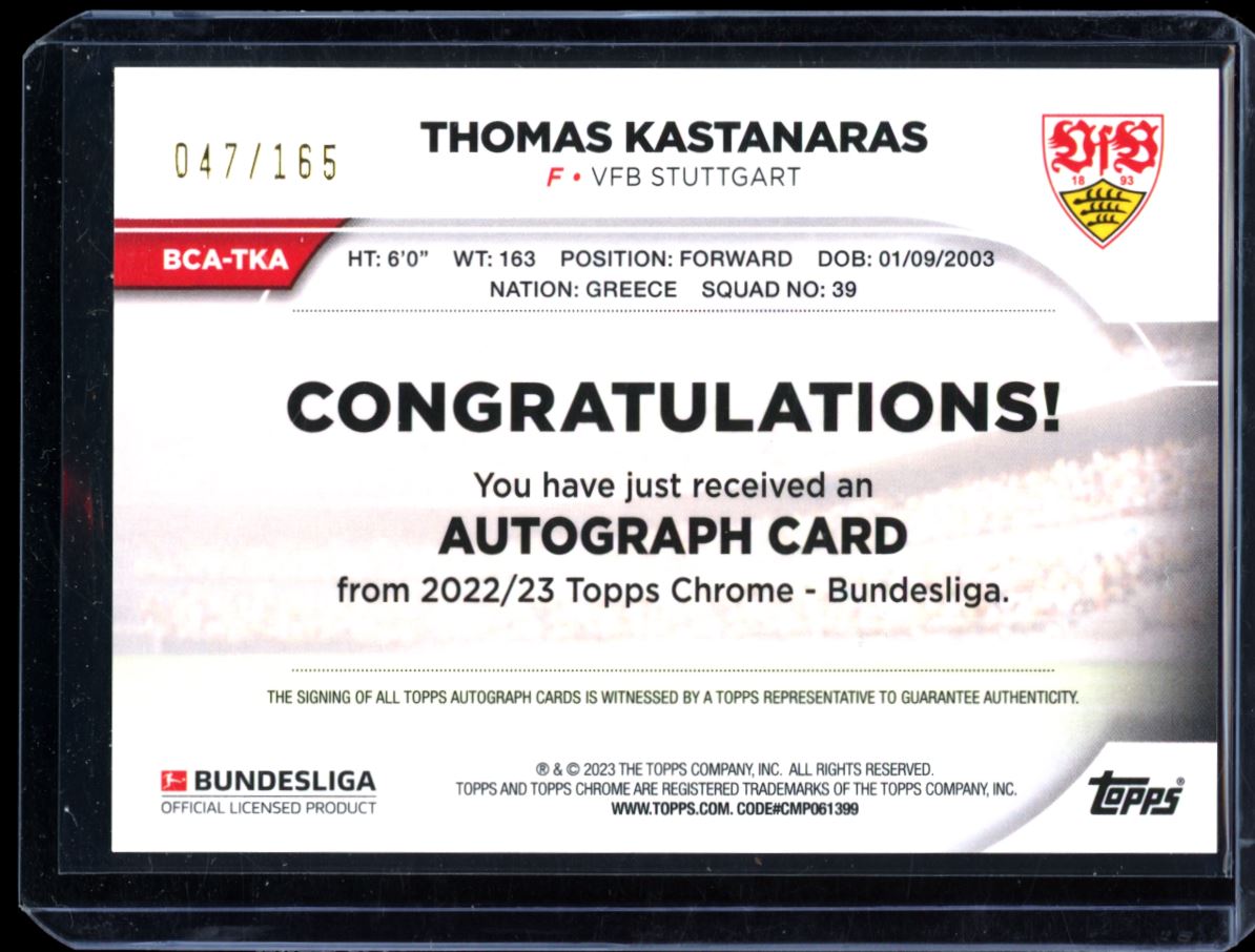 Thomas Kastanaras Hyper Prizm 047/165 2023 Topps Bundesliga Chrome Rookie Autograph Card # BCA-TKA